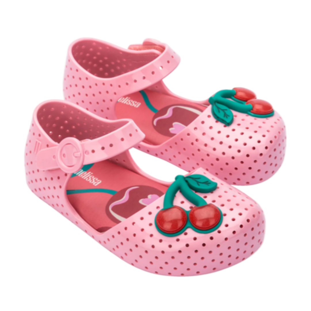 How about a flat base with small holes along its entire length, aligning design and comfort for little feet? The Mini Melissa Furadinha updates the adult classic with a touch of playfulness and romanticism. The decorations range from holey bows to fun and colorful berries! Ballerina; Melflex upper, with holes; Grenflex insole, with digital printing; Velcro closure; Top decoration in Melflex; Fruit decoration in plastisol, with painting.